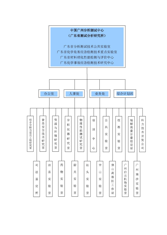 中廣測設立了面向技術領域和行業(yè)領域的技術機構,包括綜合分析與逆向工程、食品安全技術、資源與環(huán)境、分析儀器、物理性能測試技術等5個研究室,以及輻射劑量計量檢定站、司法鑒定所、校準實驗室、油品實驗室、藥物實驗室等5個專業(yè)實驗室;并在廣州白云機場及廣州南沙區(qū)設立了辦事處和實驗室,在中山市大涌鎮(zhèn)設立了紡織品實驗室,在佛山高新區(qū)設立了工作站。