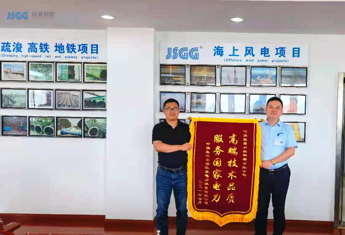 7月13日,在巨鑫鋼管會(huì)議室,中國(guó)能建集團(tuán)江蘇電力裝備有限公司王文斌主任給江蘇巨鑫鋼管公司總經(jīng)理李海軍贈(zèng)送了“高端技術(shù)品質(zhì) 服務(wù)國(guó)家電力”的錦旗,這是巨鑫鋼管首次收到國(guó)家電力行業(yè)的錦旗。項(xiàng)目執(zhí)行中,巨鑫鋼管國(guó)網(wǎng)特高壓事業(yè)部俞美蓉部長(zhǎng)熱情周到認(rèn)真的服務(wù),受到了王文斌主任的夸獎(jiǎng)。