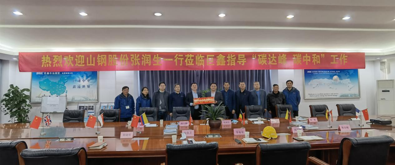 2021年11月25日,山東鋼鐵集團(tuán)股份有限公司副總經(jīng)理、山鋼股份公司日照公司總經(jīng)理張潤(rùn)生、科技質(zhì)量中心副主任周蘭聚、中厚板廠副廠長(zhǎng)劉朋、板材銷售部部長(zhǎng)潘衛(wèi)東、板材部風(fēng)電組組長(zhǎng)張凱等一行來巨鑫考察指導(dǎo)“碳達(dá)峰碳中和”工作,受到江蘇巨鑫石油鋼管有限公司(以下簡(jiǎn)稱“JSGG巨鑫鋼管”)李海軍總經(jīng)理熱情接待。