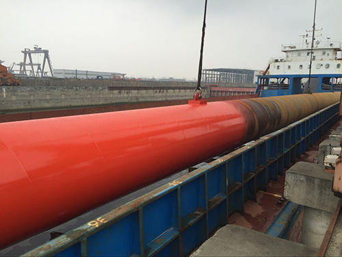 江蘇巨鑫石油鋼管有限公司承接了此項目的鋼管樁生產(chǎn)訂單3300噸,規(guī)格為:φ2200×20/30×80000mm,材質(zhì)為Q345B。其特點為:該鋼管樁由三段鋼管焊接而成。樁頂段鋼管為φ2200×30×15500mm直縫埋弧焊管,中間段為φ2200×22×63000mm為螺旋縫埋弧焊管,樁底段為φ2200×30×1500mm直縫埋弧焊管。另外,樁頂部位還需要焊接一個φ(2140-1540)×30mm圓環(huán)加強板和兩塊2102×1080×30mm加強板,焊接工作量非常大,交貨期非常緊,又加上中國傳統(tǒng)節(jié)日春節(jié),全公司上下聯(lián)動,干部員工放棄休假,全部在生產(chǎn)一線加班加點,最終按時保質(zhì)保量完成了生產(chǎn)任務(wù),確保大橋項目的順利打樁。