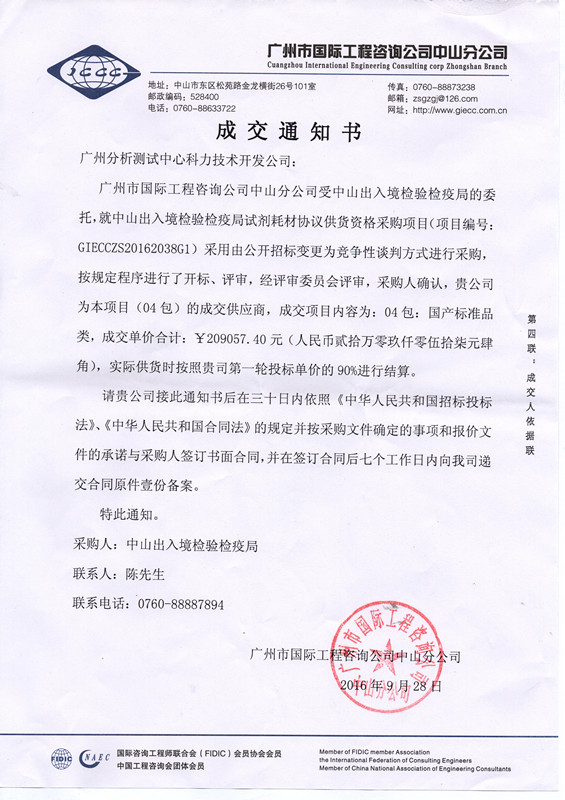 恭喜中廣測科力成為中山出入境檢驗檢疫局試劑耗材協(xié)議供貨資格采購項目(04包:國產(chǎn)標(biāo)準(zhǔn)品類)合格供應(yīng)商。中廣測科力從2002年開始代理銷售國家標(biāo)準(zhǔn)物質(zhì),是國內(nèi)最早從事標(biāo)準(zhǔn)物質(zhì)銷售和技術(shù)服務(wù)的企業(yè)之一,也是國內(nèi)全面綜合的標(biāo)準(zhǔn)物質(zhì)和標(biāo)準(zhǔn)樣品的專業(yè)供應(yīng)商之一。專業(yè)、嚴(yán)謹(jǐn)、真誠、實干是我們的服務(wù)宗旨,歡迎咨詢,請致電:020-87684186/010-64129805。