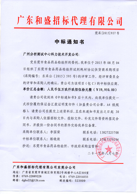 中廣測(cè)科力中得東莞市食品藥品檢驗(yàn)所試劑耗材協(xié)議供貨商資格