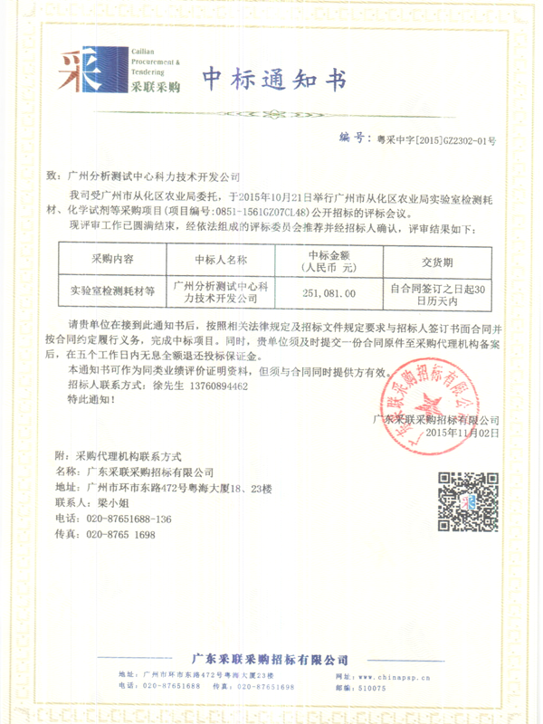 恭喜中廣測科力成為廣州市從化區(qū)農(nóng)業(yè)局實(shí)驗(yàn)室檢測耗材、化學(xué)試劑采購項(xiàng)目合格供應(yīng)商。中廣測科力從2002年開始代理銷售國家標(biāo)準(zhǔn)物質(zhì),是國內(nèi)最早從事標(biāo)準(zhǔn)物質(zhì)銷售和技術(shù)服務(wù)的企業(yè)之一,也是國內(nèi)最全面的標(biāo)準(zhǔn)物質(zhì)和標(biāo)準(zhǔn)樣品的專業(yè)供應(yīng)商之一。專業(yè)、嚴(yán)謹(jǐn)、真誠、實(shí)干是我們的服務(wù)宗旨,歡迎咨詢。