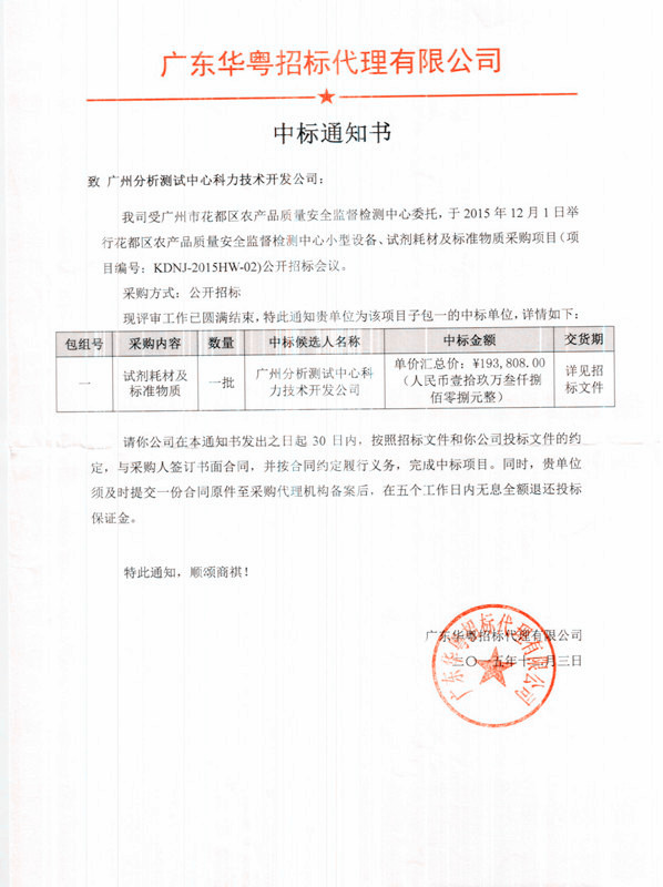 恭喜中廣測科力成為花都區(qū)農產品質量安全監(jiān)督檢測中心小型設備、試劑耗材及標準物質采購項目合格供應商。中廣測科力從2002年開始代理銷售國家標準物質,是國內最早從事標準物質銷售和技術服務的企業(yè)之一,也是國內最全面的標準物質和標準樣品的專業(yè)供應商之一。專業(yè)、嚴謹、真誠、實干是我們的服務宗旨,歡迎咨詢,請致電:020-87684186。
