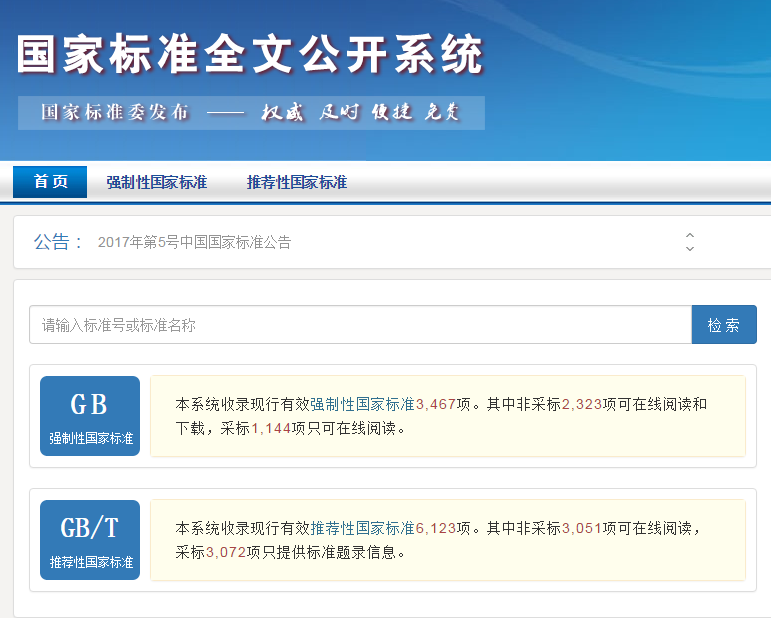 目前,系統(tǒng)公開了質(zhì)檢總局、國家標準委2017年1月1日前已批準發(fā)布的所有強制性國家標準及基礎(chǔ)類推薦性國家標準(非采標),其他推薦性國家標準(非采標)將在2017年底前陸續(xù)完成公開。