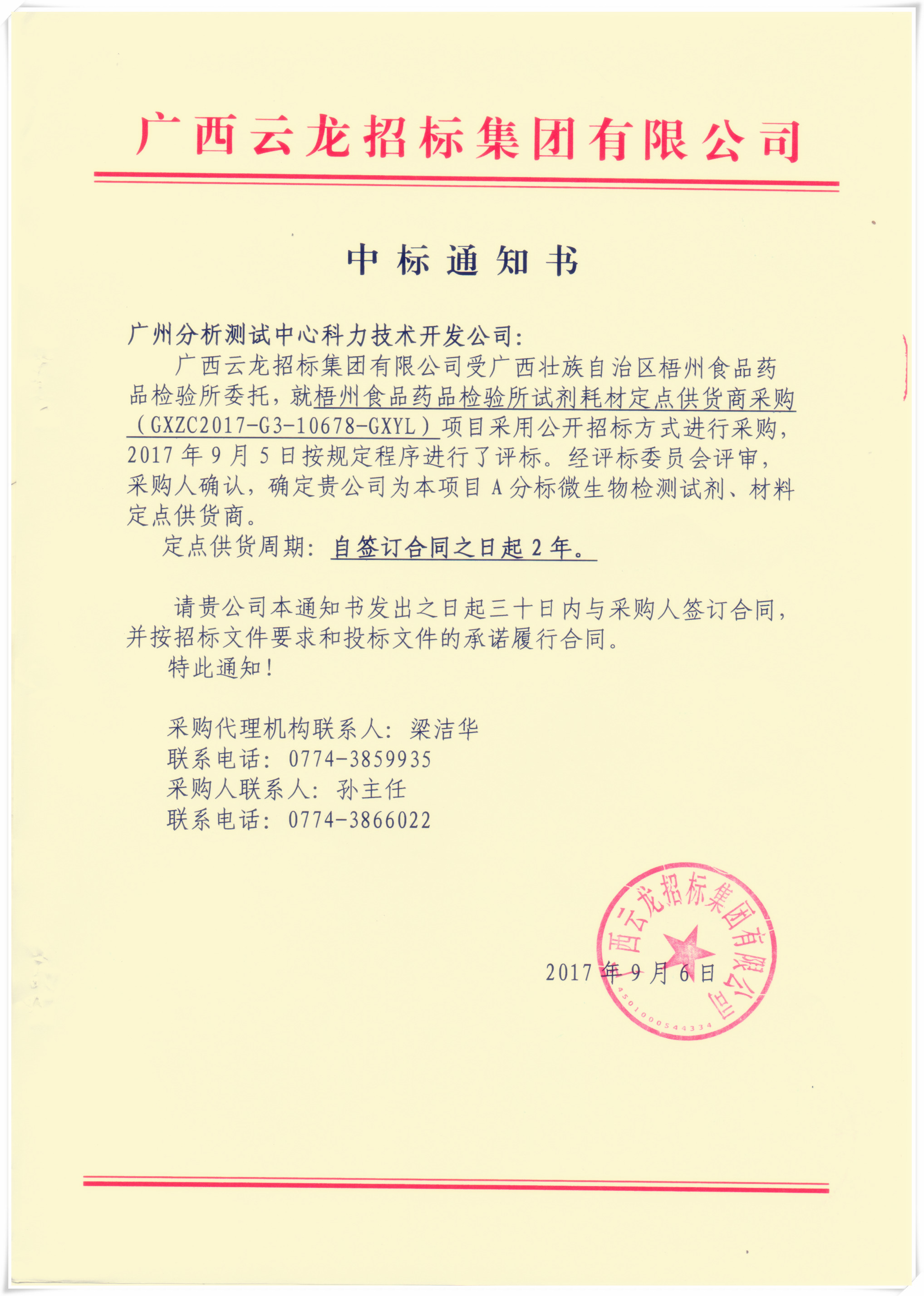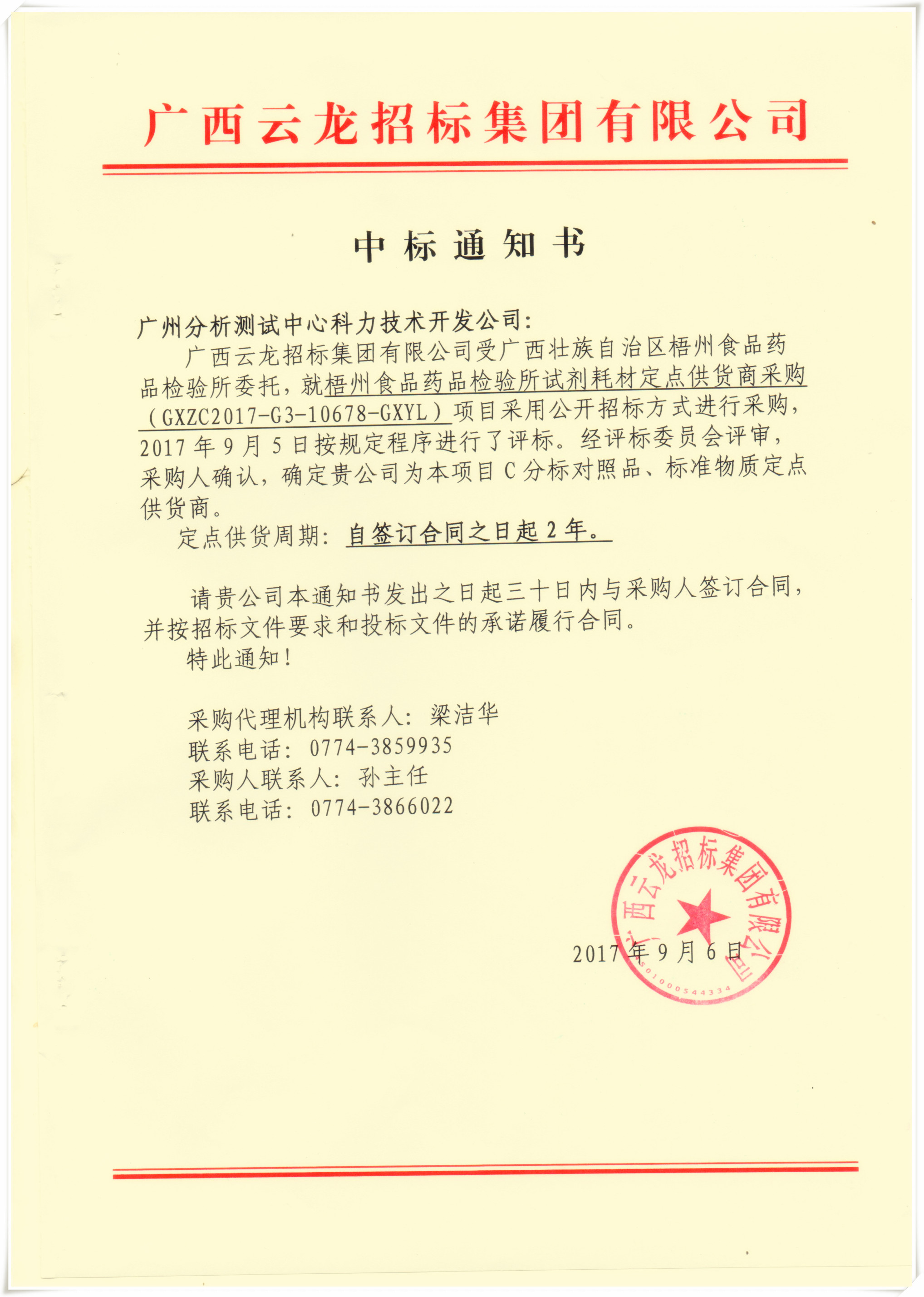 恭喜中廣測科力成為2017年梧州食品藥品檢驗(yàn)所試劑耗材定點(diǎn)供貨商采購項(xiàng)目A分包及C分包合格供應(yīng)商。中廣測科力從2002年開始代理銷售國家標(biāo)準(zhǔn)物質(zhì),是國內(nèi)最早從事標(biāo)準(zhǔn)物質(zhì)銷售和技術(shù)服務(wù)的企業(yè)之一,也是國內(nèi)全面綜合的標(biāo)準(zhǔn)物質(zhì)和標(biāo)準(zhǔn)樣品的專業(yè)供應(yīng)商之一。專業(yè)、嚴(yán)謹(jǐn)、真誠、實(shí)干是我們的服務(wù)宗旨,歡迎咨詢,請(qǐng)致電:020-87684186/010-64129805。