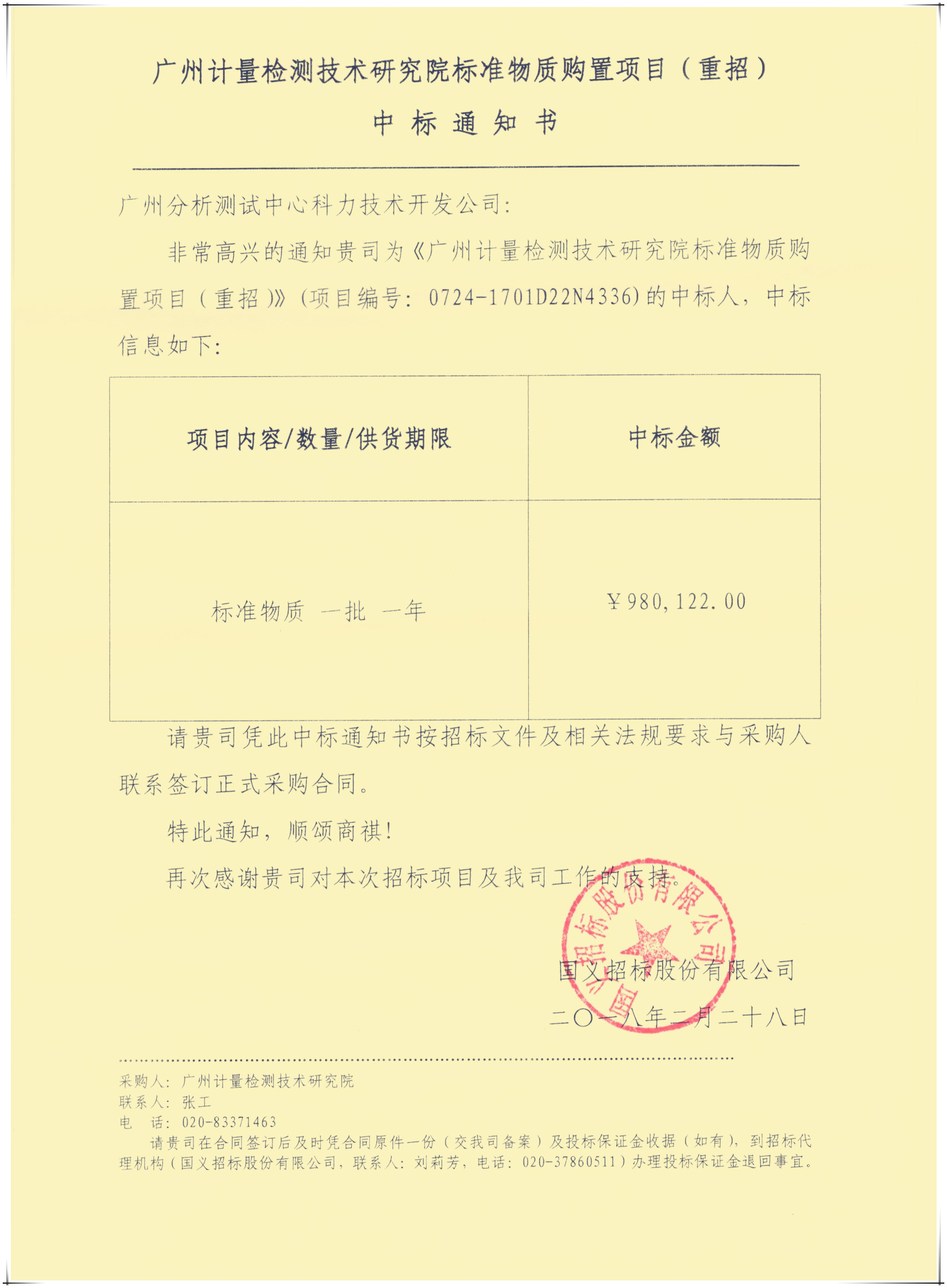 恭喜中廣測科力成為廣州計量檢測技術研究院標準物質購置項目(重招)項目合格供應商。中廣測科力從2002年開始代理銷售國家標準物質,是國內最早從事標準物質銷售和技術服務的企業(yè)之一,也是國內全面綜合的標準物質和標準樣品的專業(yè)供應商之一。專業(yè)、嚴謹、真誠、實干是我們的服務宗旨,歡迎咨詢,請致電:020-87684186/010-64129805。