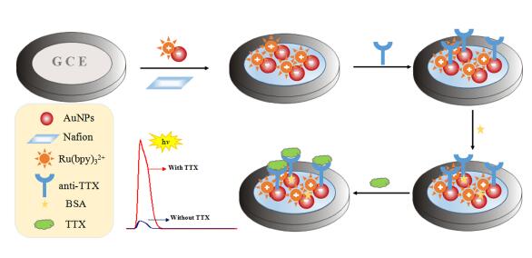 寧波大學(xué)材料科學(xué)與化工學(xué)院王邃副教授發(fā)現(xiàn)TTX不僅可作為免疫傳感器中的目標(biāo)物與其抗體特異性結(jié)合,還可作為Ru(bpy)32+的共反應(yīng)物。因此,該課題組以Nafion固定釕聯(lián)吡啶Au納米顆粒(Ru(bpy)32+-AuNPs)于玻碳電極表面,借助Au—N共價(jià)鍵固定河豚毒素抗體(anti-TTX),通過抗原抗體的特異性結(jié)合構(gòu)建了超靈敏檢測(cè)TTX的免標(biāo)記自增強(qiáng)電化學(xué)發(fā)光免疫傳感器。當(dāng)目標(biāo)物TTX被特異性捕獲到修飾電極表面后,可作為Ru(bpy)32+的共反應(yīng)物增強(qiáng)ECL信號(hào)。與共反應(yīng)物存在于溶液中或者標(biāo)記到二抗上相比,其優(yōu)點(diǎn)在于發(fā)光體和共反應(yīng)物之間的電子轉(zhuǎn)移距離更短,可有效改善電化學(xué)發(fā)光效率,減小實(shí)驗(yàn)成本。最佳條件下,TTX質(zhì)量濃度在0.01~1000 μg·L-1范圍內(nèi)與ECL信號(hào)呈良好的線性關(guān)系,檢出限(LOD)為0.01 μg·L-1。此免標(biāo)記自增強(qiáng)型ECL免疫傳感器顯示出優(yōu)異的穩(wěn)定性、重現(xiàn)性和靈敏度。其對(duì)實(shí)際樣品中TTX的回收率為98.0% ~ 104.0%,表明具有較好的實(shí)用價(jià)值。