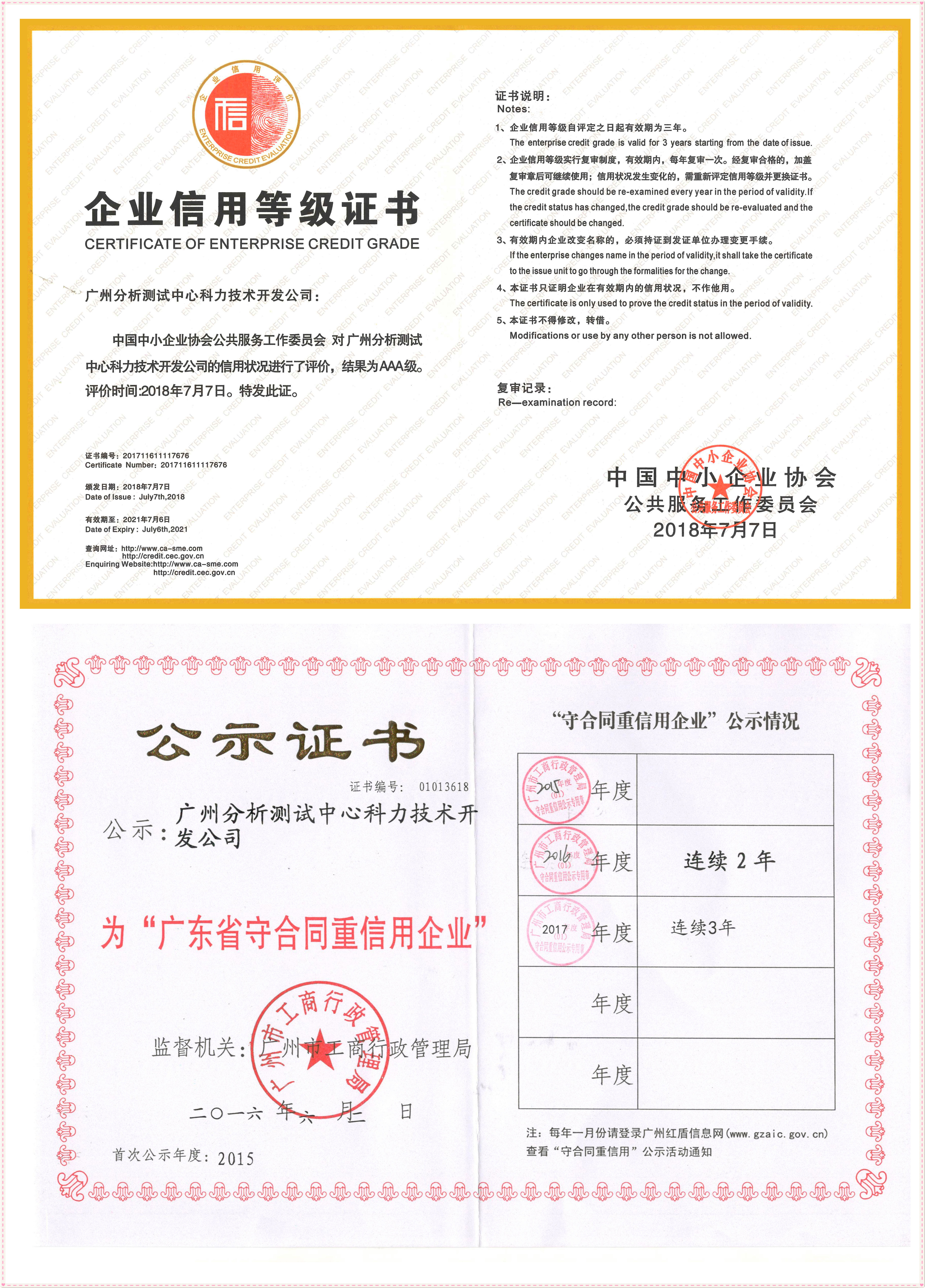 我公司一直秉承著“誠(chéng)實(shí)守信、規(guī)范管理”的管理理念,在今年7月又一次榮獲了由中國(guó)中小企業(yè)協(xié)會(huì)頒發(fā)的“企業(yè)信用等級(jí)AAA級(jí)”證書,有效期為三年;同期我公司連續(xù)三年榮獲了由廣州市工商行政管理局頒發(fā)的“廣東省守合同重信用企業(yè)”證書。