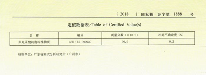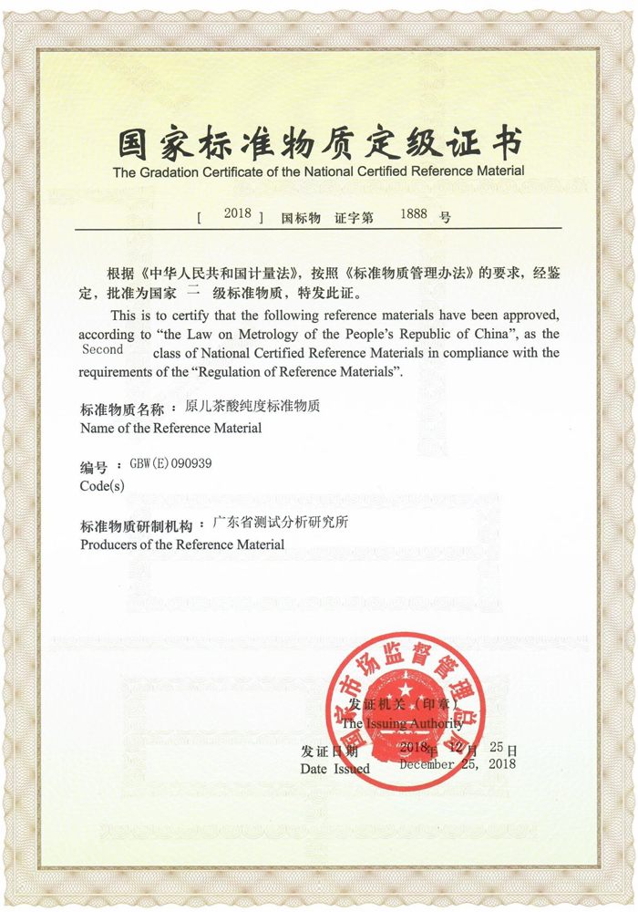 中廣測(cè)自2014年開(kāi)始研制中廣測(cè)對(duì)照品,目前常規(guī)產(chǎn)品品種達(dá)到365種,2015年我們加入到全國(guó)標(biāo)準(zhǔn)物質(zhì)管理委員會(huì),成為團(tuán)體委員單位,2016年我們向標(biāo)準(zhǔn)物質(zhì)委員會(huì)提出了申報(bào)國(guó)家二級(jí)標(biāo)準(zhǔn)物質(zhì)。經(jīng)過(guò)兩年多的努力,“原兒茶酸純度標(biāo)準(zhǔn)物質(zhì)”在今年成為第一個(gè)獲批的二級(jí)標(biāo)準(zhǔn)物質(zhì),標(biāo)準(zhǔn)物質(zhì)編號(hào)GBW(E)090939。由中廣測(cè)科力代理銷(xiāo)售該產(chǎn)品,歡迎廣大用戶(hù)使用并提出寶貴意見(jiàn)。