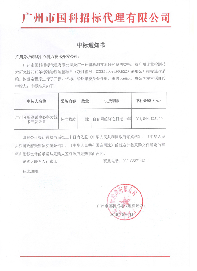 恭喜中廣測科力成為廣州計量檢測技術(shù)研究院2019年標準物質(zhì)購置項目合格供應(yīng)商。中廣測科力從2002年開始代理銷售國家標準物質(zhì),是國內(nèi)最早從事標準物質(zhì)銷售和技術(shù)服務(wù)的企業(yè)之一,也是國內(nèi)全面綜合的標準物質(zhì)和標準樣品的專業(yè)供應(yīng)商之一。
