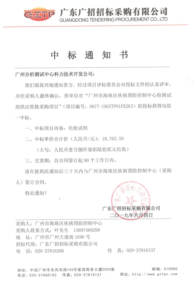 恭喜中廣測科力成為廣州市海珠區(qū)疾病預(yù)防控制中心檢測試劑供應(yīng)資格采購項(xiàng)目合格供應(yīng)商。中廣測科力從2002年開始代理銷售國家標(biāo)準(zhǔn)物質(zhì),是國內(nèi)最早從事標(biāo)準(zhǔn)物質(zhì)銷售和技術(shù)服務(wù)的企業(yè)之一,也是國內(nèi)全面綜合的標(biāo)準(zhǔn)物質(zhì)和標(biāo)準(zhǔn)樣品的專業(yè)供應(yīng)商之一。