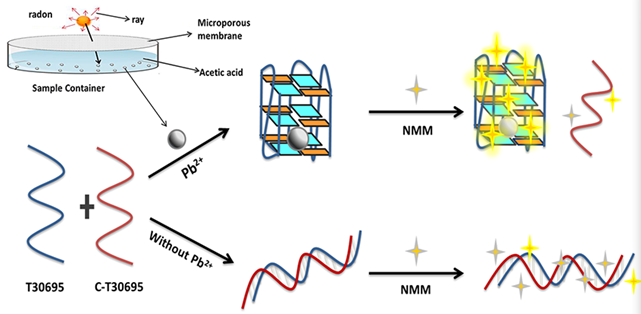 傳統(tǒng)的放射性氣體氡的檢測(cè)方法,多以放射性射線為對(duì)象,運(yùn)用核科學(xué)和物理學(xué)手段開展研究。通過α、β粒子或射線檢測(cè)氡的累積濃度,方法復(fù)雜、費(fèi)時(shí),對(duì)環(huán)境和檢測(cè)人員存在放射性污染。氡衰變形成穩(wěn)定的子體鉛只需約3.82 d,且衰變產(chǎn)生的子體鉛210Pb非常穩(wěn)定,其半衰期長(zhǎng)達(dá)21年。南華大學(xué)呂昌銀教授小組緊緊圍繞“氡的穩(wěn)定子體鉛210Pb半衰期漫長(zhǎng)”的核放射特點(diǎn),認(rèn)定210Pb是氡研究的一個(gè)穩(wěn)定的化學(xué)指標(biāo),并根據(jù)鉛的現(xiàn)代生物學(xué)檢測(cè)最新進(jìn)展,提出了功能化核酸適配體探針的氡輻射檢測(cè)研究新方法——利用非標(biāo)記熒光傳感檢測(cè)氡。他們以氡輻射的子體鉛為目標(biāo)檢測(cè)物,并使用含0.2%醋酸吸收液的采樣皿進(jìn)行被動(dòng)式采樣。待氡進(jìn)入采樣皿后,衰變產(chǎn)生子體鉛,隨后在稀醋酸中轉(zhuǎn)變形成鉛離子。該研究發(fā)現(xiàn),氡的子體鉛誘導(dǎo)核酸適體T30695形成的G-四鏈體結(jié)構(gòu)能與N-甲基卟啉二丙酸Ⅸ(NMM)熒光染料結(jié)合發(fā)出較強(qiáng)熒光,且熒光強(qiáng)度與Pb2+的濃度和氡累積輻射劑量濃度成正比。該法對(duì)鉛的檢出限為1.54×10-9 mol/L,對(duì)氡的檢出限為1.07×104 Bq·h/m3。該工作新創(chuàng)了應(yīng)用醋酸被動(dòng)式采集放射性物質(zhì)氡及其子體鉛的化學(xué)采樣方法,開拓了非金屬、放射性、惰性氣體物質(zhì)的生物分析技術(shù)新領(lǐng)域。作為氡累積濃度測(cè)量方法,排除了檢測(cè)人員的放射性危害,采樣方法便捷,檢測(cè)技術(shù)成熟。