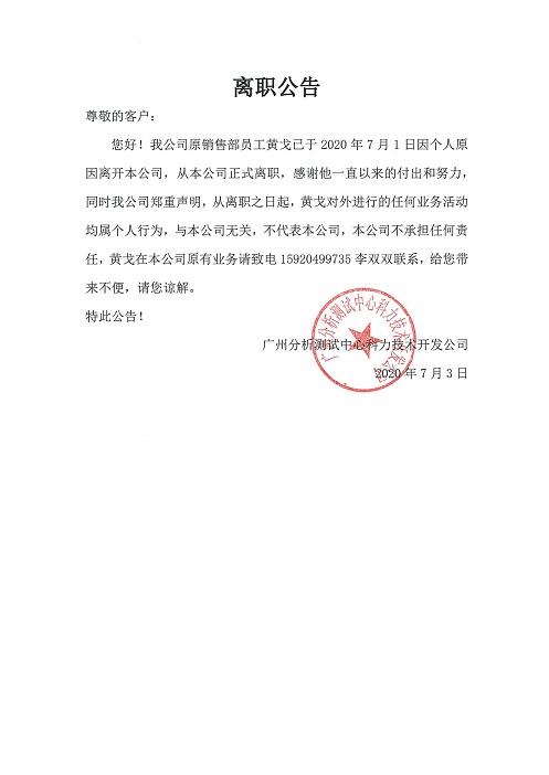 您好!我公司原銷售部員工黃戈已于2020年7月1日因個(gè)人原因離開本公司,從本公司正式離職,感謝他一直以來的付出和努力,同時(shí)我公司鄭重聲明,從離職之日起,黃戈對外進(jìn)行的任何業(yè)務(wù)活動均屬個(gè)人行為,與本公司無關(guān),不代表本公司,本公司不承擔(dān)任何責(zé)任,黃戈在本公司原有業(yè)務(wù)請致電15920499735李雙雙聯(lián)系,給您帶來不便,請您諒解。