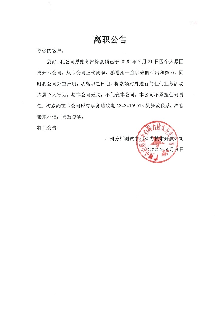 您好!我公司原賬務(wù)部梅素娟已于2020年7月31日因個(gè)人原因離開本公司,從本公司正式離職,感謝她一直以來的付出和努力,同時(shí)我公司鄭重聲明,從離職之日起,梅素娟對外進(jìn)行的任何業(yè)務(wù)活動(dòng)均屬個(gè)人行為,與本公司無關(guān),不代表本公司,本公司不承擔(dān)任何責(zé)任,梅素娟在本公司原有事務(wù)請致電13434109913吳靜敏聯(lián)系,給您帶來不便,請您諒解。