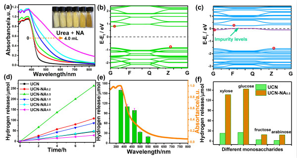 中廣測光電功能材料與器件研究團(tuán)隊(duì)設(shè)計(jì)開發(fā)了一種邊緣氨基功能化的新型聚合型氮化碳基光催化劑,并結(jié)合光譜儀、電化學(xué)工作站、氣相色譜等手段和理論計(jì)算對其進(jìn)行性能表征和優(yōu)化。研究發(fā)現(xiàn)改性后的光催化劑具有可見光寬光譜吸收(見下圖),其光譜響應(yīng)活性范圍可拓展至600nm,相比于現(xiàn)有的生物質(zhì)制氫光催化劑(一般僅能吸收475 nm以下的光),顯著拓寬了可見光吸收;同時(shí)分析了其能帶結(jié)構(gòu),發(fā)現(xiàn)催化劑的氧化能力得到提升,且能促進(jìn)生物質(zhì)在催化劑表面的吸附活化,因而有效地提高了光催化生物質(zhì)產(chǎn)氫效率。