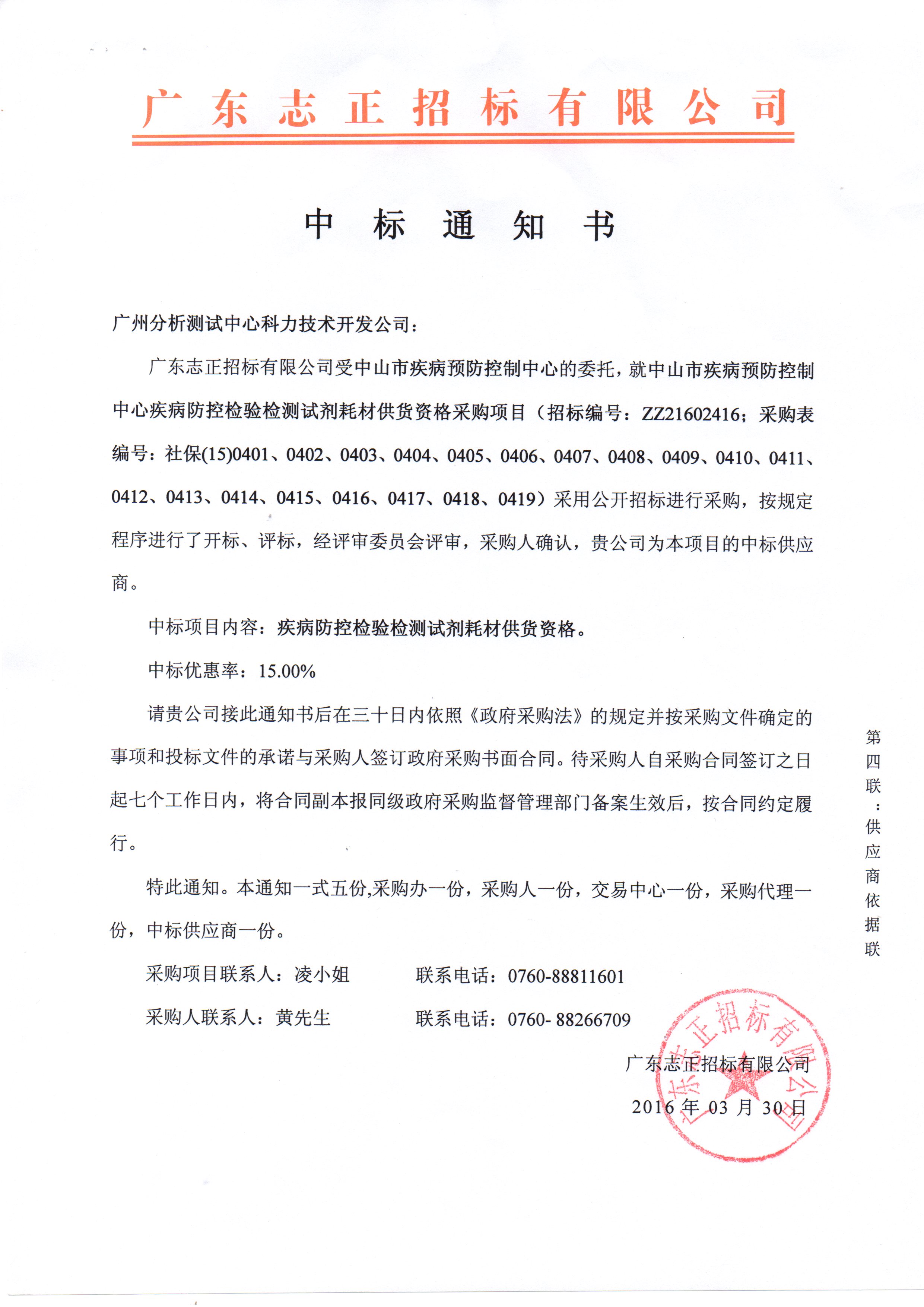 恭喜中廣測科力成為中山市疾病預(yù)防控制中心疾病防控檢驗(yàn)檢測試劑耗材供貨資格采購項(xiàng)目的合格供應(yīng)商。中廣測科力從2002年開始代理銷售國家標(biāo)準(zhǔn)物質(zhì),是國內(nèi)最早從事標(biāo)準(zhǔn)物質(zhì)銷售和技術(shù)服務(wù)的企業(yè)之一,也是國內(nèi)全面綜合的標(biāo)準(zhǔn)物質(zhì)和標(biāo)準(zhǔn)樣品的專業(yè)供應(yīng)商之一。專業(yè)、嚴(yán)謹(jǐn)、真誠、實(shí)干是我們的服務(wù)宗旨,歡迎咨詢,請致電:020-87684186。