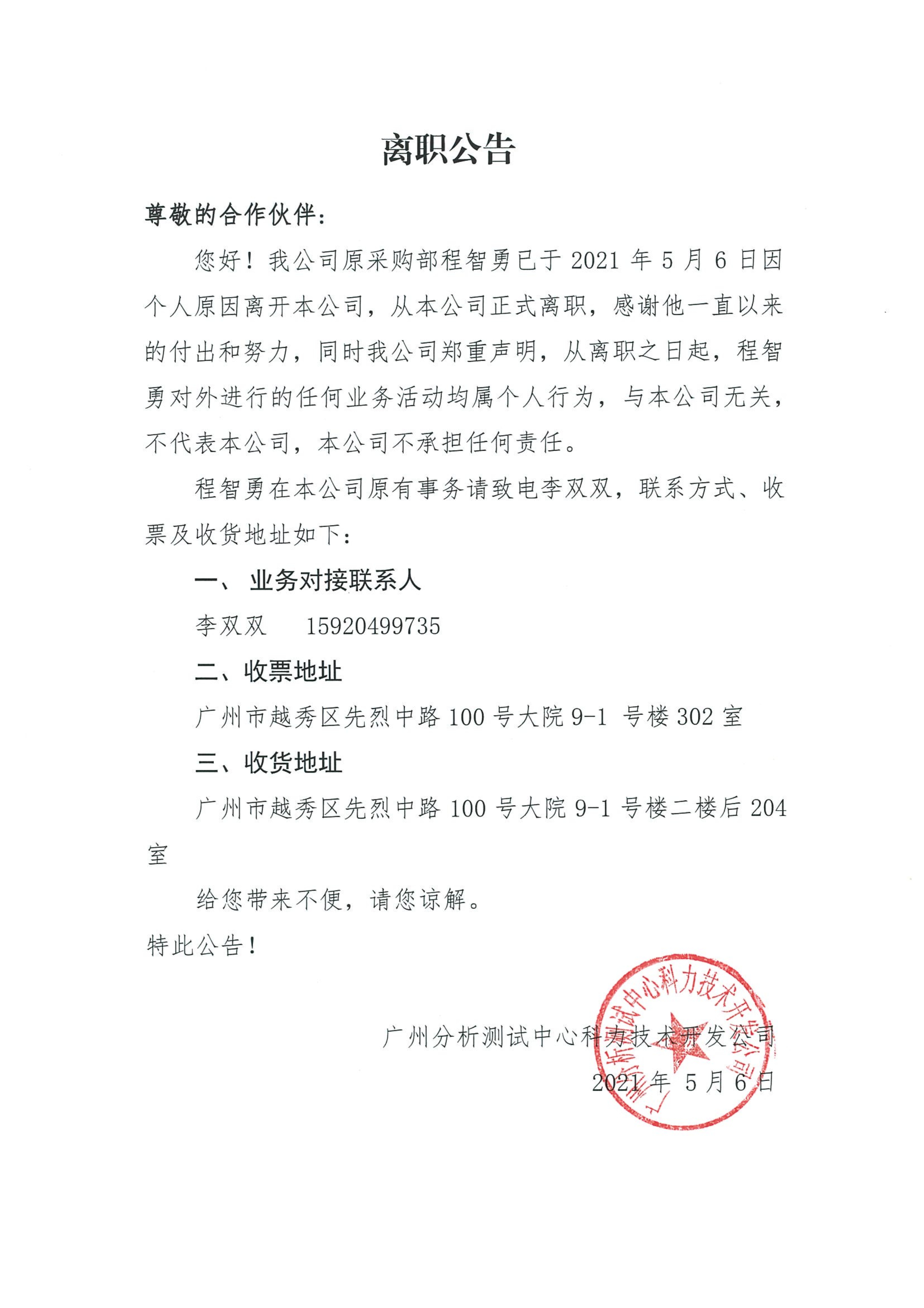 您好!我公司原采購部程智勇已于2021年5月6日因個人原因離開本公司,從本公司正式離職,感謝他一直以來的付出和努力,同時我公司鄭重聲明,從離職之日起,程智勇對外進行的任何業(yè)務(wù)活動均屬個人行為,與本公司無關(guān),不代表本公司,本公司不承擔任何責任,程智勇在本公司原有事務(wù)請致電15920499735李雙雙聯(lián)系,給您帶來不便,請您諒解。
