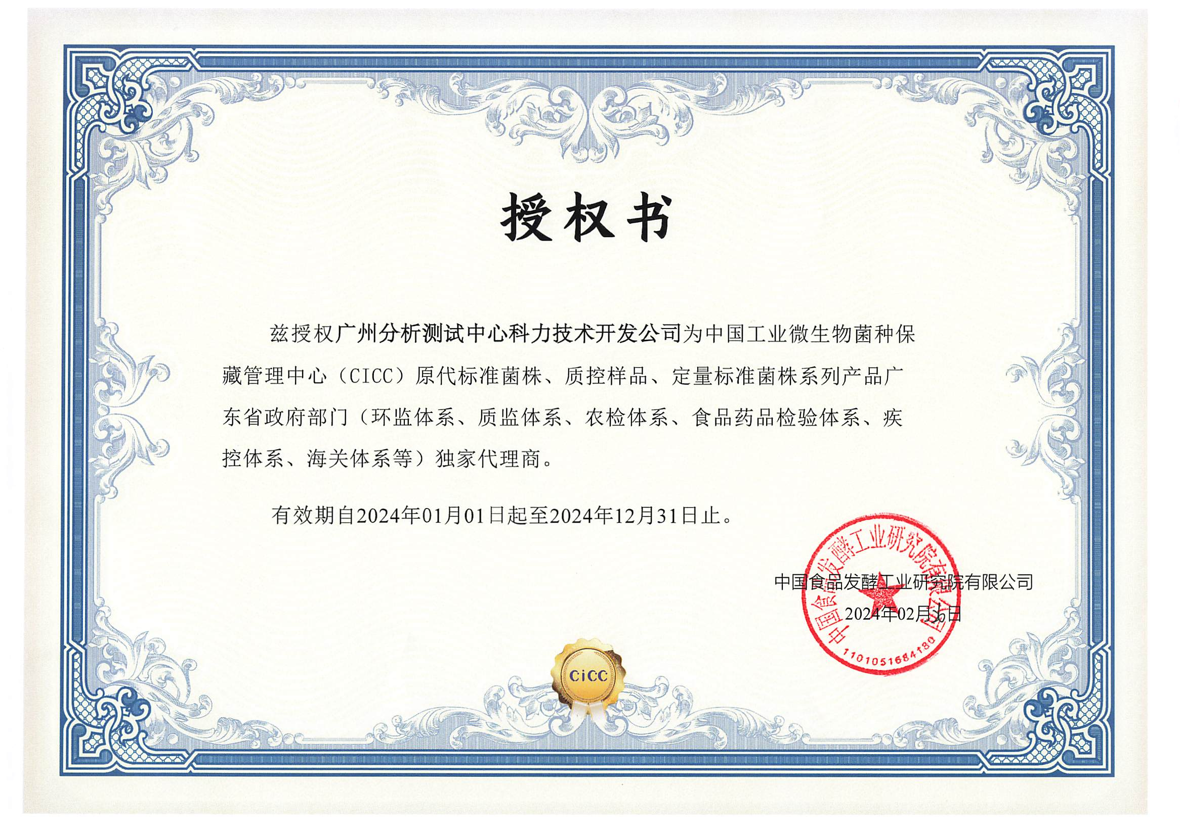 茲授權(quán)廣州分析測試中心科力技術(shù)開發(fā)公司為中國工業(yè)微生物菌種保藏管理中心(CICC)原代標(biāo)準(zhǔn)菌株、質(zhì)控樣品、定量標(biāo)準(zhǔn)菌株系列產(chǎn)品廣東省政府部門(環(huán)監(jiān)體系、質(zhì)監(jiān)體系、農(nóng)檢體系、食品藥品檢驗(yàn)體系、疾控體系、海關(guān)體系等)獨(dú)家代理商。有效期自2024年01月01日起至2024年12月31日止。