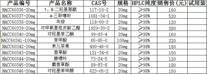 中廣測(cè)憑借高水平的研發(fā)團(tuán)隊(duì)和先進(jìn)的儀器設(shè)備,近年來(lái)自主研發(fā)天然產(chǎn)物對(duì)照品、藥品對(duì)照品和化學(xué)對(duì)照品,并提供化學(xué)對(duì)照品定制服務(wù),提供毫克級(jí)至百克級(jí)的產(chǎn)品。中廣測(cè)對(duì)照品已有346個(gè)產(chǎn)品,如有需要,請(qǐng)致電020-87684186訂購(gòu)或?yàn)g覽m.cdhuayou.cn查看,咨詢(xún)我們的業(yè)務(wù)員。