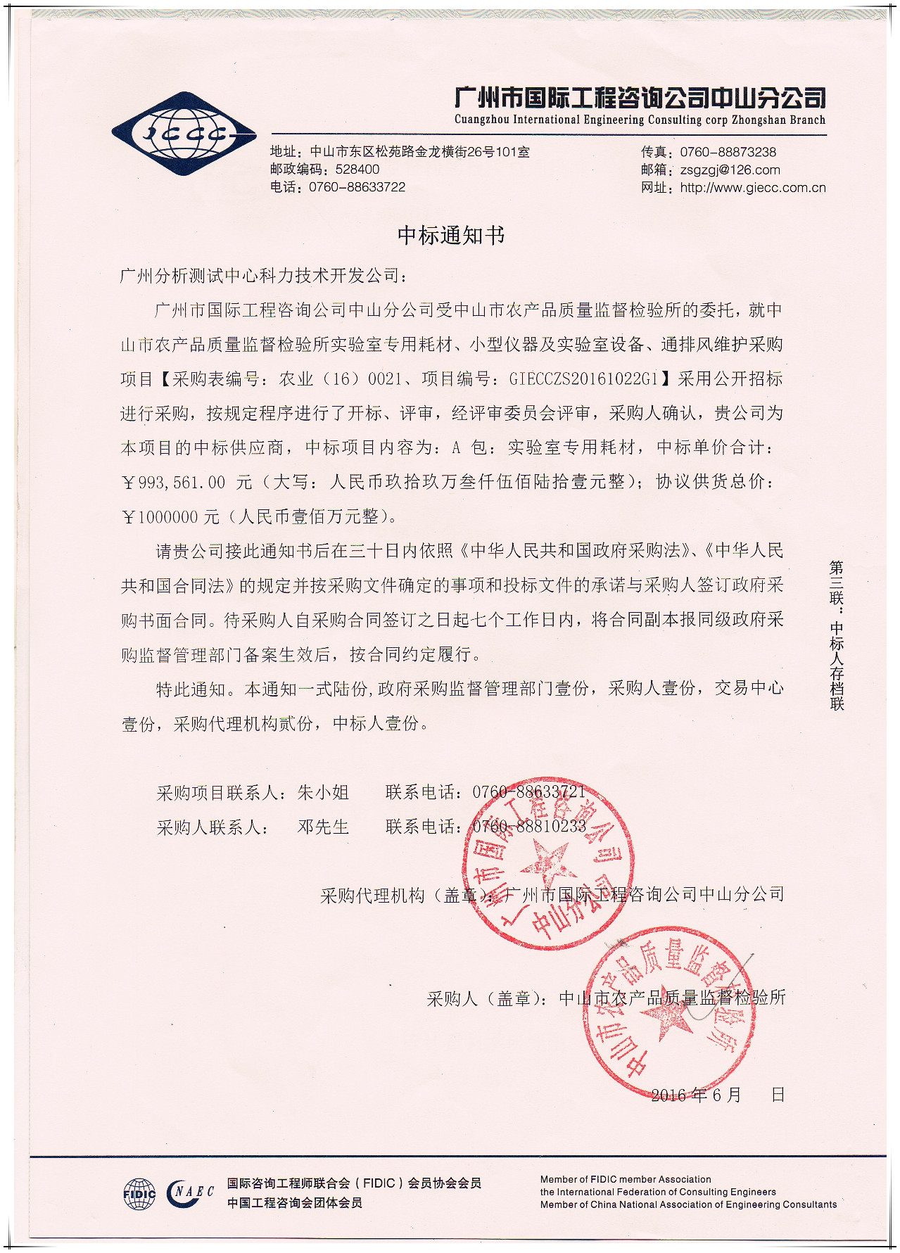 恭喜中廣測科力成為中山市農(nóng)產(chǎn)品質(zhì)量監(jiān)督檢驗(yàn)所實(shí)驗(yàn)室專用耗材、小型儀器及實(shí)驗(yàn)室設(shè)備、通排風(fēng)維護(hù)采購項(xiàng)目合格供應(yīng)商。中廣測科力從2002年開始代理銷售國家標(biāo)準(zhǔn)物質(zhì),是國內(nèi)最早從事標(biāo)準(zhǔn)物質(zhì)銷售和技術(shù)服務(wù)的企業(yè)之一,也是國內(nèi)全面綜合的標(biāo)準(zhǔn)物質(zhì)和標(biāo)準(zhǔn)樣品的專業(yè)供應(yīng)商之一。專業(yè)、嚴(yán)謹(jǐn)、真誠、實(shí)干是我們的服務(wù)宗旨,歡迎咨詢,請(qǐng)致電:020-87684186/010-64129805。