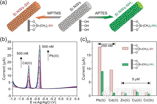 基于此,課題組研究人員分別制備出巰基化和氨基化多孔Si納米線并將其修飾在電極上實(shí)現(xiàn)對(duì)Cd(II)和Pb(II)的高選擇性檢測(cè)。相比于氨基化多孔Si納米線,巰基化的材料表現(xiàn)出更好的檢測(cè)效果,這主要?dú)w因于巰基對(duì)重金屬離子具有更大的親和力。除此之外,巰基化Si納米線修飾電極還可用于Cd(II)和Pb(II)的無干擾同時(shí)檢測(cè)。在多孔Si材料表面修飾不同的有機(jī)基團(tuán)可實(shí)現(xiàn)對(duì)其它重金屬離子的有效檢測(cè),該工作為借助有機(jī)基團(tuán)增強(qiáng)重金屬離子的電化學(xué)檢測(cè)信號(hào)提供了新思路。