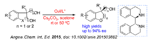 近期,課題組采用CuI/手性環(huán)狀二胺催化體系,成功地克服了鈀催化體系中的一些缺點(diǎn),以高光學(xué)選擇性、高收率實(shí)現(xiàn)了不對(duì)稱去對(duì)稱化芳基C-O偶聯(lián)反應(yīng)構(gòu)建手性苯并2,3-二氫呋喃、苯并二氫吡喃結(jié)構(gòu)。并且通過(guò)這一催化體系,可以高光學(xué)選擇性地構(gòu)建全碳四級(jí)手性中心。