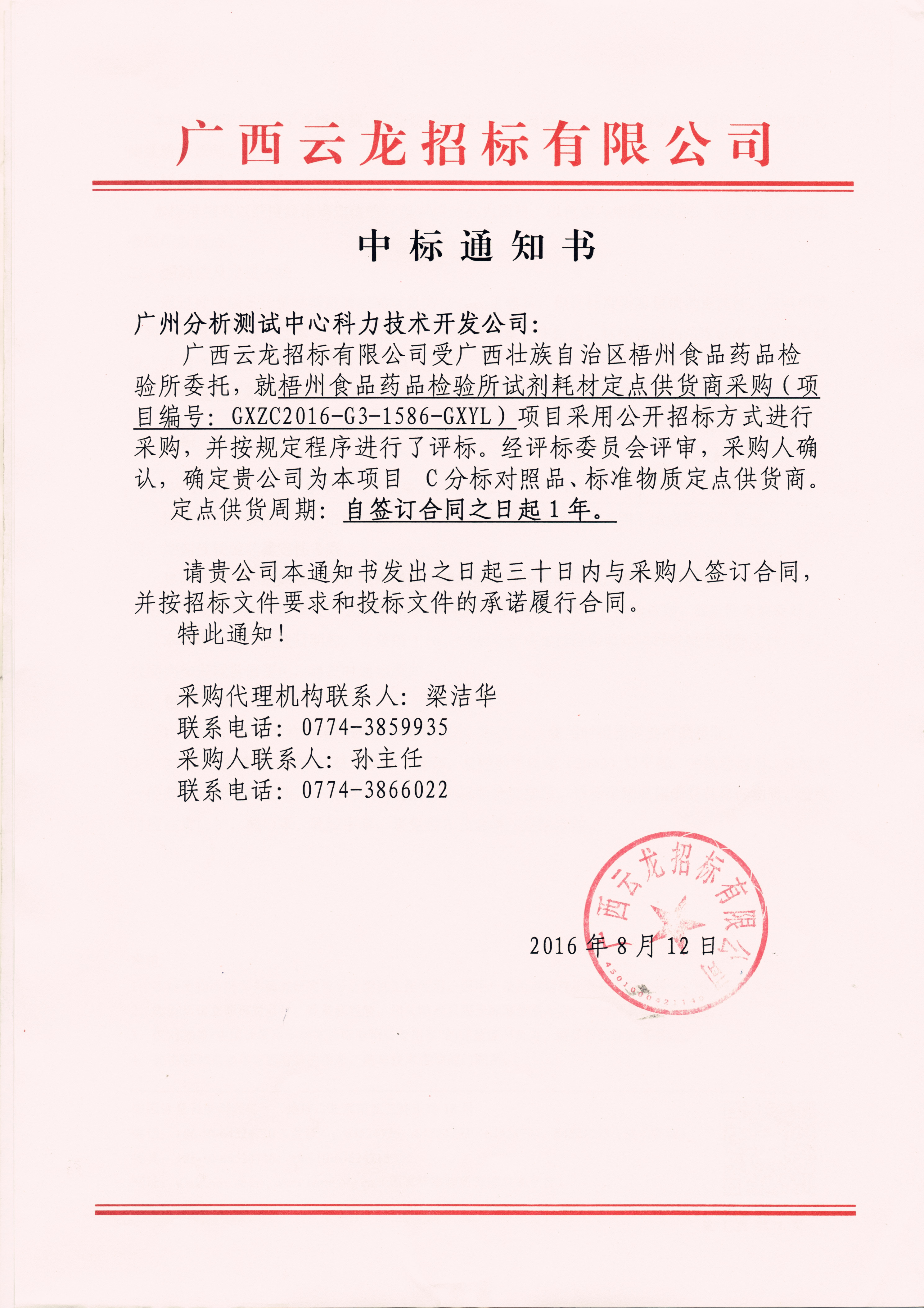 恭喜中廣測科力成為梧州食品藥品檢驗(yàn)所試劑耗材定點(diǎn)供貨商采購項(xiàng)目(C包組)合格供應(yīng)商。中廣測科力從2002年開始代理銷售國家標(biāo)準(zhǔn)物質(zhì),是國內(nèi)最早從事標(biāo)準(zhǔn)物質(zhì)銷售和技術(shù)服務(wù)的企業(yè)之一,也是國內(nèi)全面綜合的標(biāo)準(zhǔn)物質(zhì)和標(biāo)準(zhǔn)樣品的專業(yè)供應(yīng)商之一。專業(yè)、嚴(yán)謹(jǐn)、真誠、實(shí)干是我們的服務(wù)宗旨,歡迎咨詢,請致電:020-87684186/010-64129805。