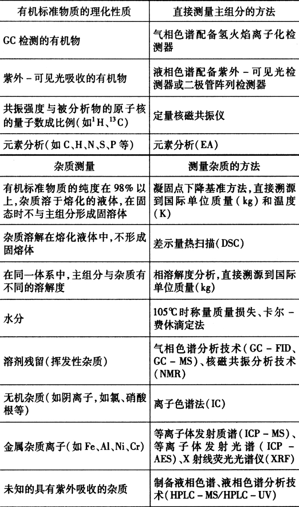 其中,①直接測(cè)量主組分的方法包含氣相色譜方法(GC)、氣相色譜-質(zhì)譜聯(lián)用方法(GC-MS)、液相色譜方法(LC)、液相色譜-質(zhì)譜聯(lián)用方法(LC-MS)、定量核磁方法(qNMR)、元素分析方法和滴定方法(重量滴定和容量滴定);②測(cè)量雜質(zhì)的方法包含雜質(zhì)總量的測(cè)量方法,如凝固點(diǎn)下降基準(zhǔn)方法和差示掃描量熱法(DSC)、相溶解度法、水分的測(cè)定方法、殘留溶劑的測(cè)定方法和無(wú)機(jī)雜質(zhì)的測(cè)定方法。